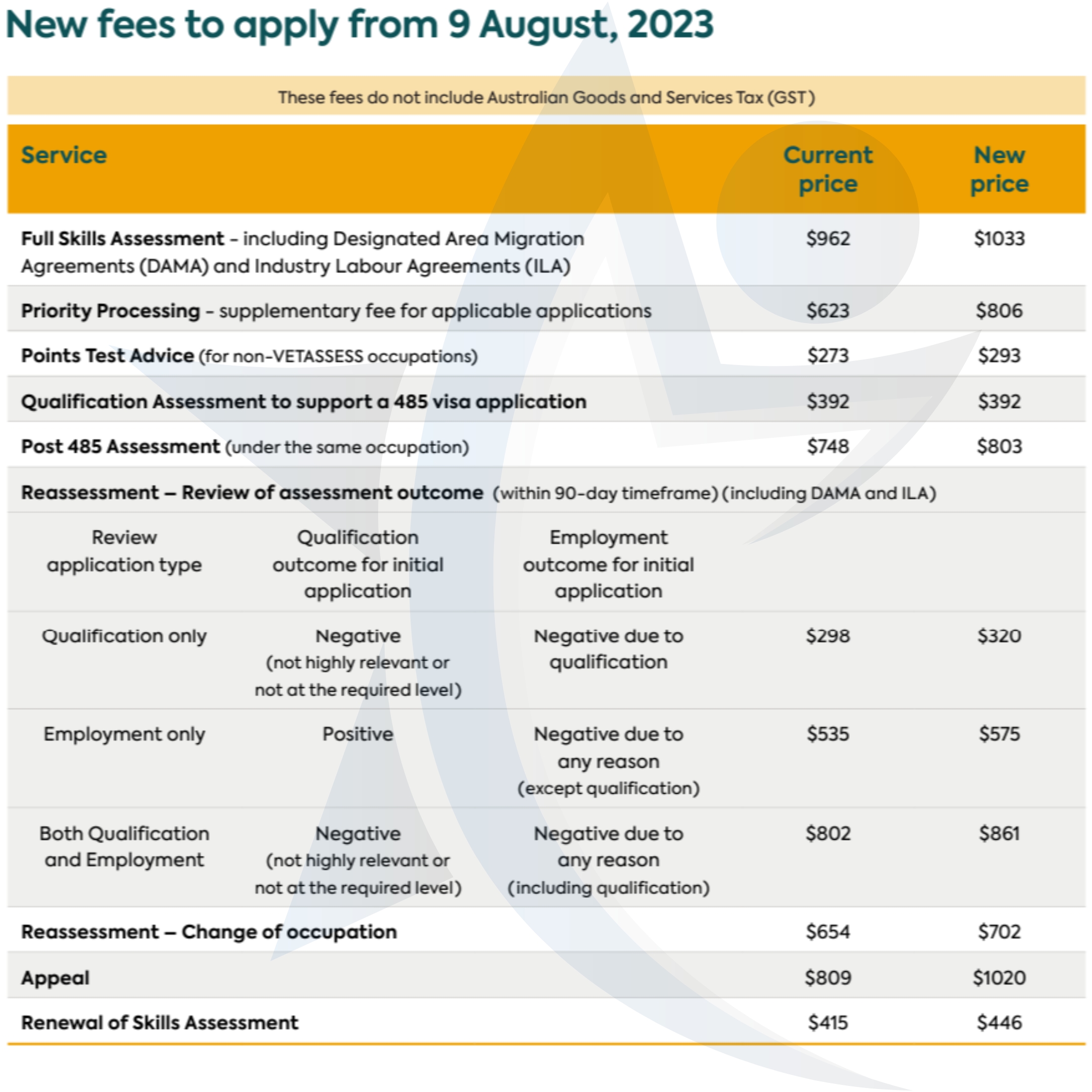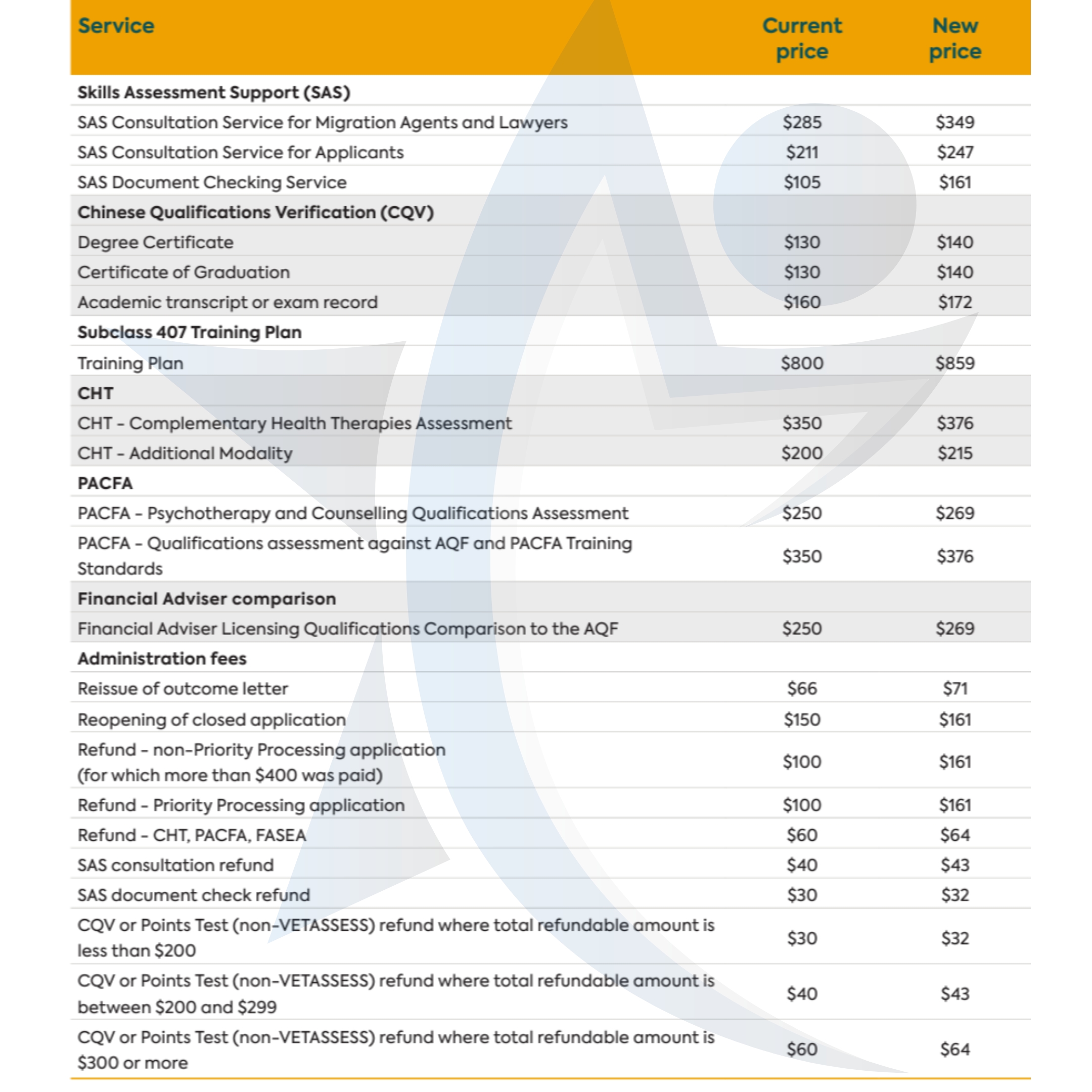 از تاریخ 9 آگوست 2023 هزینه های جدید اسسمنت سازمان وتاسس تغییر کرده و متقاضیان با قیمت های جدید بررسی میشود.