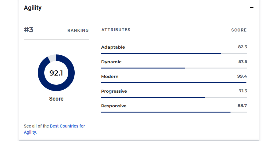برای اینکه یک کشور دارای مهارت و سرزندگی باشد، باید خود را با هر موانعی که با آن روبرو می شود سازگار کند و پاسخ مناسب ارائه دهد . برای انجام این کار، یک کشور باید در اقدامات خود کارآمد باشد، راه حل های مدرن را اتخاذ و بپذیرد، و برای مواجهه با شرایط متغیر پیشرفت کند. این کشورها به عنوان سازگارترین کشورها با تغییر ، در نظر گرفته می شوند.