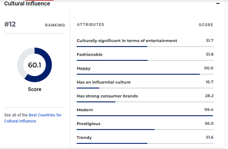 کشورهایی که نفوذ فرهنگی دارند اغلب هماهنگ با غذای خوب، مد و زندگی آسان هستند. آنها ترند هستند  در دریافت فرهنگ از کشورهای دیگر انعطاف پذیری خوبی دارند به عنوان مثال در زمینه هایی مانند موسیقی، تلویزیون و فیلم‌ ، جذب فرهنگ‌های دیگر می‌شوند و بخشی از یک گفتگوی جهانی گسترده‌تر می‌شوند. این کشورها در زمینه هایی مانند مد و سرگرمی پیشرو هستند.