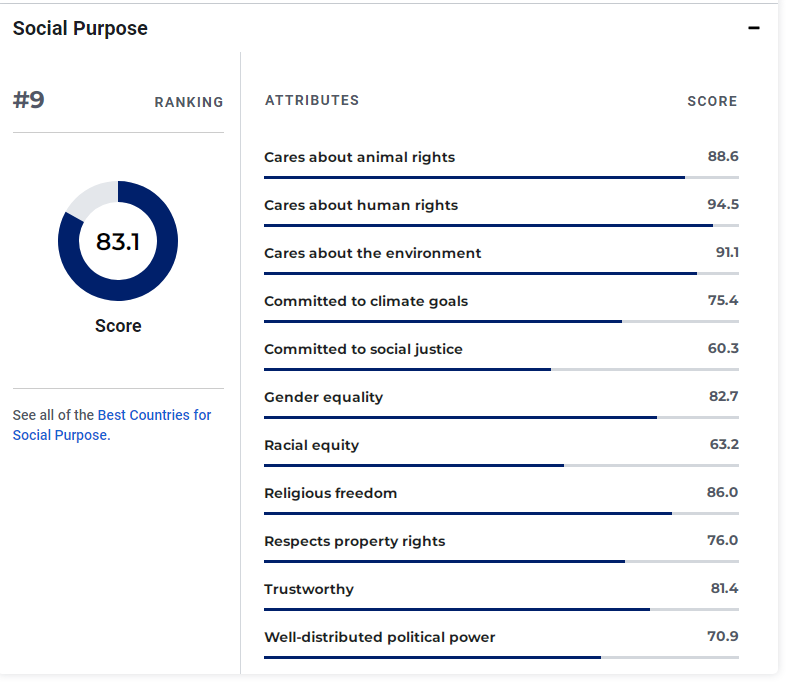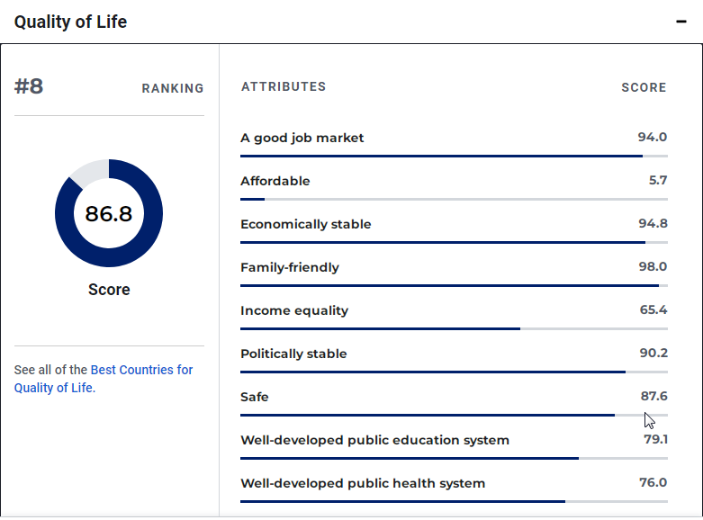 فراتر از ایده های اساسی دسترسی گسترده به غذا، مسکن، آموزش با کیفیت، مراقبت های بهداشتی و اشتغال، کیفیت زندگی ممکن است شامل موارد نامشهودی مانند امنیت شغلی، ثبات سیاسی، آزادی فردی و کیفیت محیطی نیز باشد. در تمام مراحل زندگی، این کشورها رفتار خوبی با شهروندان خود دارند.