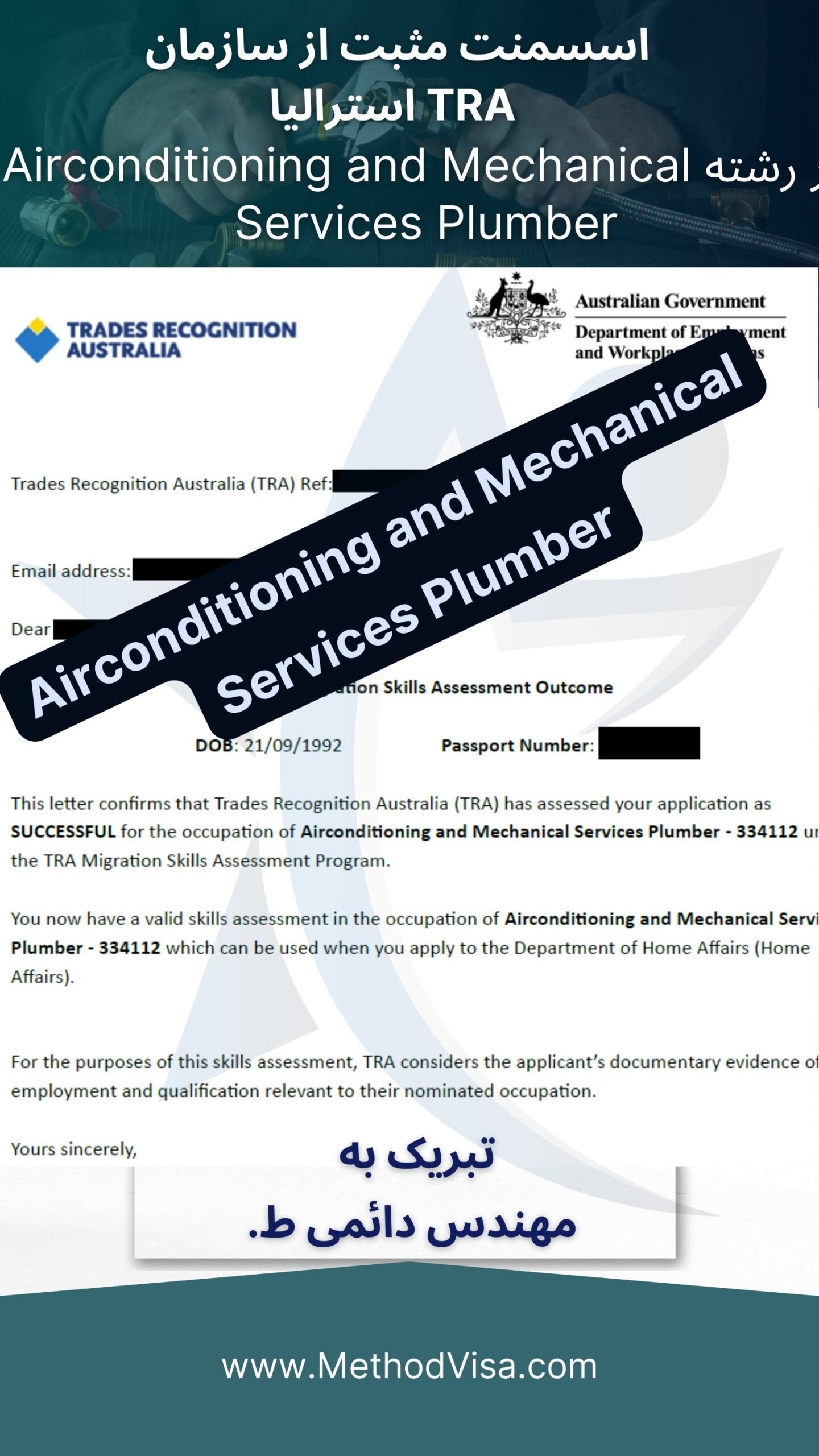 ارزیابی مدارک برای کد شغلی لوله کش خدمات تهویه مطبوع و مکانیکی ( Airconditioning and Mechanical Services Plumber ) با سازمان TRA می باشد.