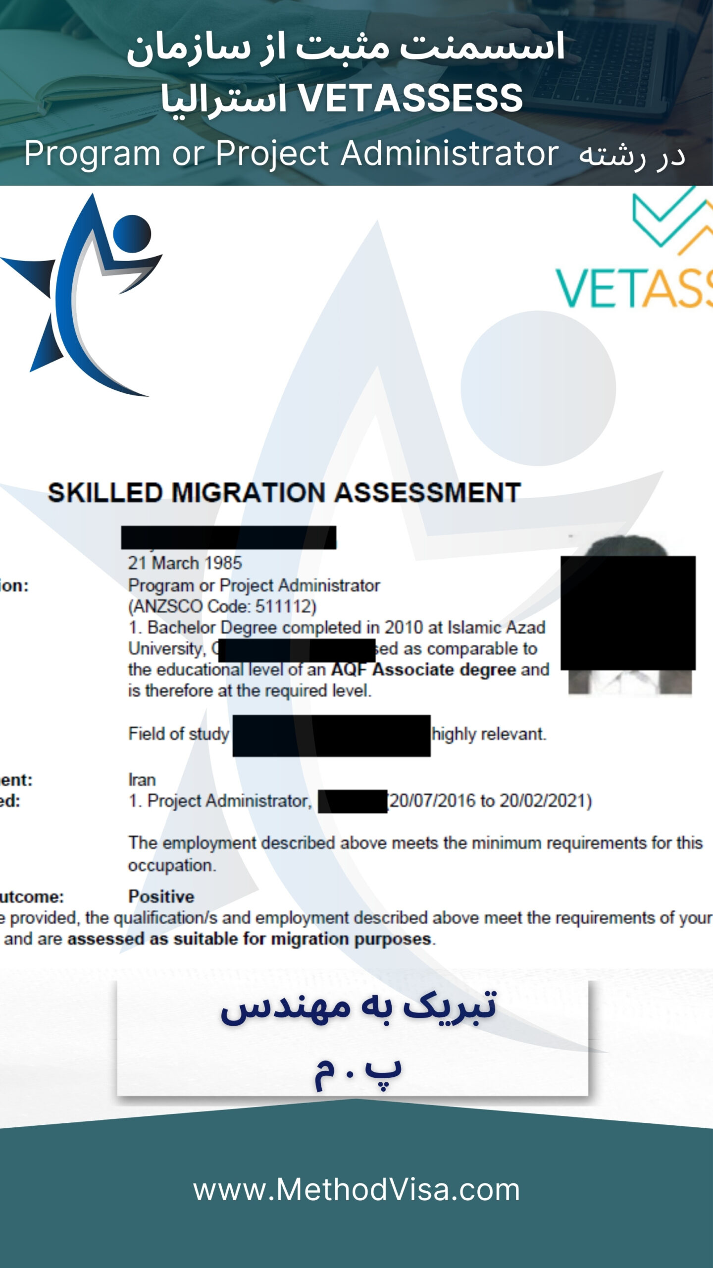 در ادامه میتوانید اسسمنت مثبت درسمت شغلی مدیر برنامه یا پروژه که توسط موسسه مهاجرتی متدویزا دریافت شده مشاهده نمایید.