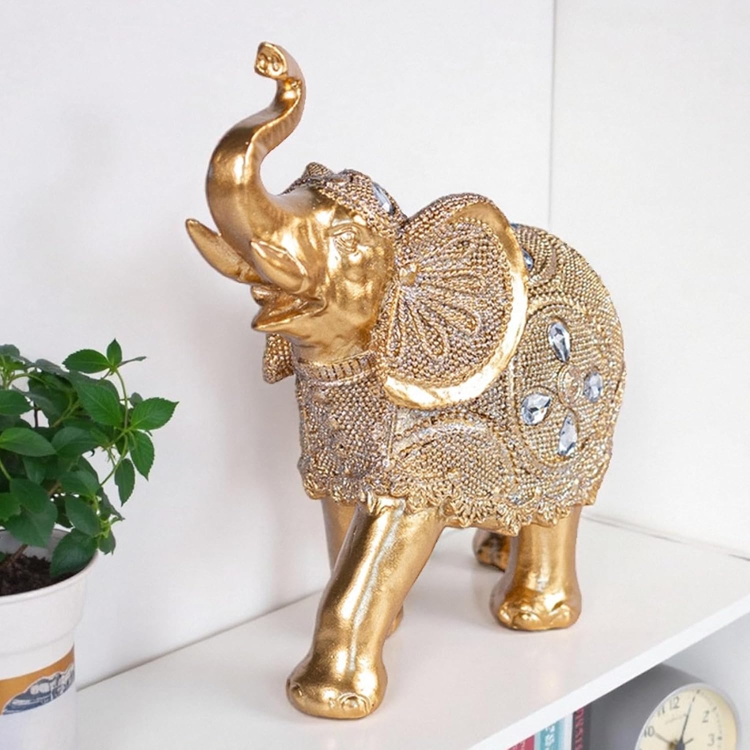 Transform your living space with this stunning gold-finished elephant figurine, a masterpiece of modern decorative art that symbolizes fortune and prosperity. this majestic sculpture features intricate lace-like patterns adorned with sparkling crystal accents that catch and reflect light beautifully. The antique gold finish adds a touch of luxury and elegance to any room, making it perfect for display on shelves, tables, or as a striking centerpiece. Crafted from high-quality resin with meticulous attention to detail, this freestanding elephant statue showcases an uplifted trunk - a traditional symbol of good luck. The modern Nordic Art Deco style blends seamlessly with various decor themes, from contemporary to traditional settings. Easy to maintain with simple dusting using a soft, dry cloth, this sophisticated piece brings an air of abundance and artistic charm to your home decor. Its substantial presence and exquisite craftsmanship make it an ideal decorative accent for living rooms, offices, or any space needing a touch of elegance.