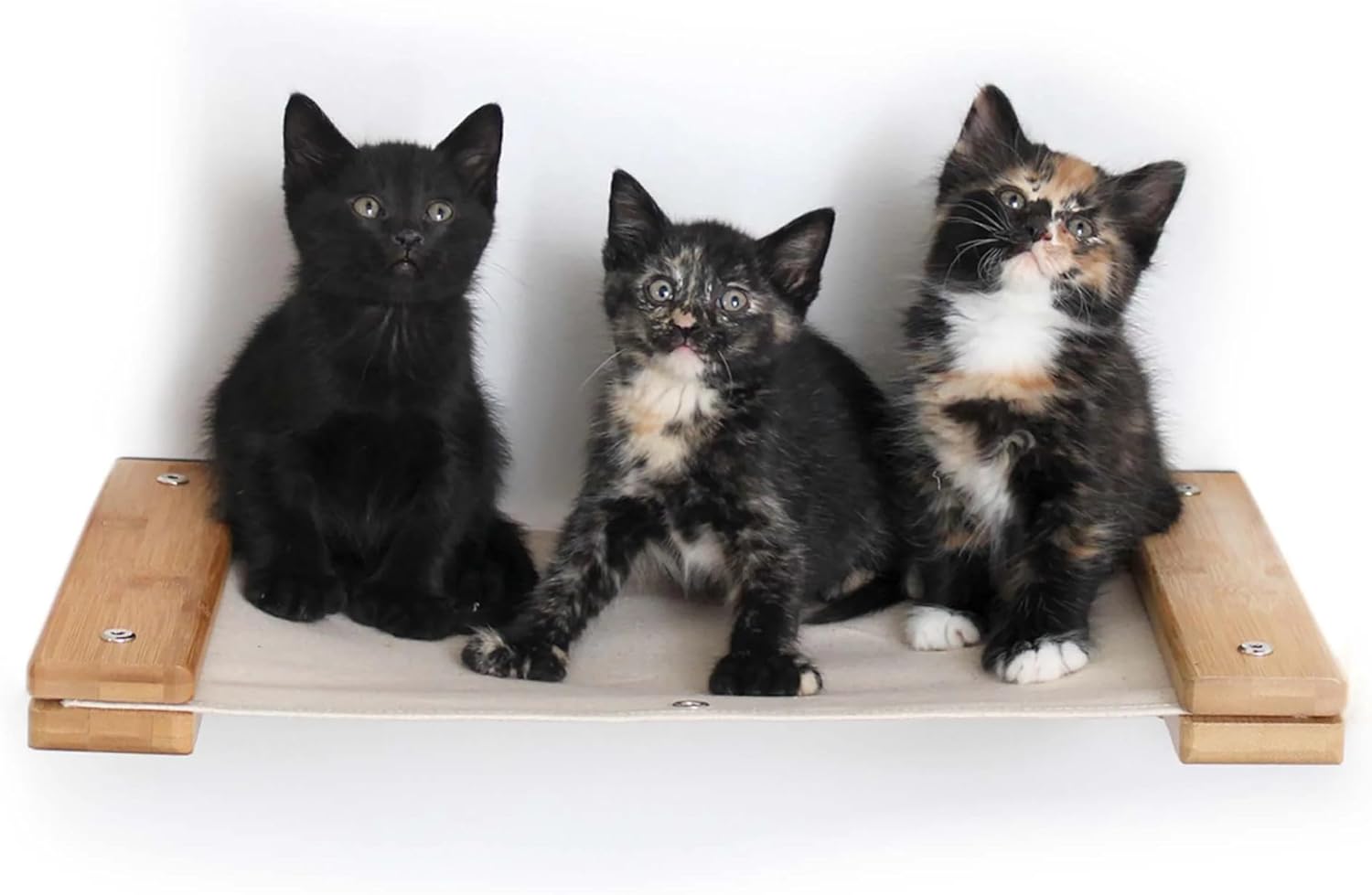 Catastrophic Creations Cat Ladder & Hammock: Your cat needs a strong outlet for climbing and scratching, a territory all to itself. Our cat shelf for wall mounting provides your feline with vertical space, secure from any perceived danger. The cat perch planks are designed from bamboo, a sustainable, sturdy, and more durable alternative to hardwood. Also, the hammock for cats features high-quality canvas fabric which comes pre-cut and hemmed. Our cat climbing shelves have been tested to support weights of up to 85 lbs. on their 18” wide platform. Every detail of the cat steps for wall is fine-tuned: hidden brackets for a floating look, sanded tops for increased traction, and a fine, clean finish. Our cat wall shelf is sanded in its finish so your furry buddies can lounge as they wish without falling. Fix the wall mounted cat tree and hammock as a standalone or build a condo for your cat to have fun indoors! Pair your cat lounger and cat hammocks with plush adhesive beds, feeders/treat boxes, planters, and sisal poles for a scratcher and a lounger in one! With step-by-step written and video instructions included, this cat ramp and cat tree hammock will be a breeze for you to install and enjoyable for the cat(s) to get their me-time! --- Included Wooden Cat Tree Accessories: Mounting Plank Tops x 3, Mounting Plank Bottoms x 3, Ladder Pieces x 2, 2 pre-cut sections of grommeted fabric, (A) 3 Grommets x 1, (B) 4 Grommets x 1 --- Kitty Hammock Fabric Care Instructions: Use a cold, gentle machine cycle or hand wash in cold water. Hang to dry. --- About Us: Catastrophic Creations started in 2013 after we brought our first cat, Ickle, home. As we were outfitting our house for him, we started playing around with some unconventional ideas and making them ourselves. We now have four cats with whom we leave our product prototypes to test their working. We feel incredibly lucky to have landed in a career where we get to work with and for cats
