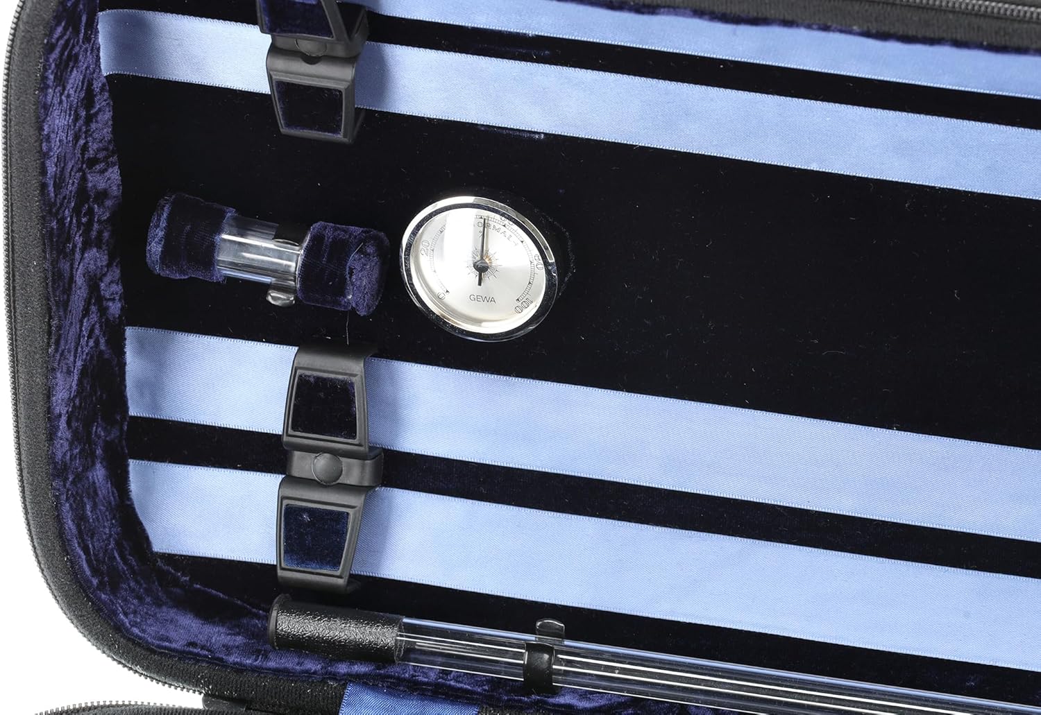 GEWA's Violin Case, Atlanta, Oblong, 4/4, in Black/Diamond-Pattern Blue, crafted in Germany. It boasts a unique thermoplastic shell, offering exceptional break resistance. Weighing approximately 6.4 lbs, it provides excellent insulation with a thermal conductivity of just 0.025 W/mK. The case features a padded suspension system, a GEWA patented swivel type holder, and a flexible bow holder. It includes a functional, detachable accessory pocket, two detachable Neoprene rucksack straps for comfort, and interior black velour padding with a protection blanket. Secured by a combination lock, it also has an attached music sheet pocket.