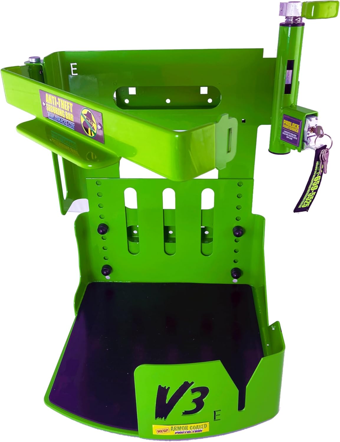 The World's Fastest and Most Secure Backpack Blower Rack. Features a patent designed locking system and shielded lock. Other new features include a Stainless Steel Padlock, Spring Loaded Automatic Locking Mechanism, Improved UV Powder Coating, Anti-Vibration Rubber Skid Pad and a Vinyl Coated Securing Bar. Made from heavy duty steel and heavy duty powder coating. Have your blower secured in minutes, not hours with our easy assembly. No epoxy, no grinders, no extra investment. (BACKPACK BLOWER IS NOT INCLUDED IN PRICE.)
