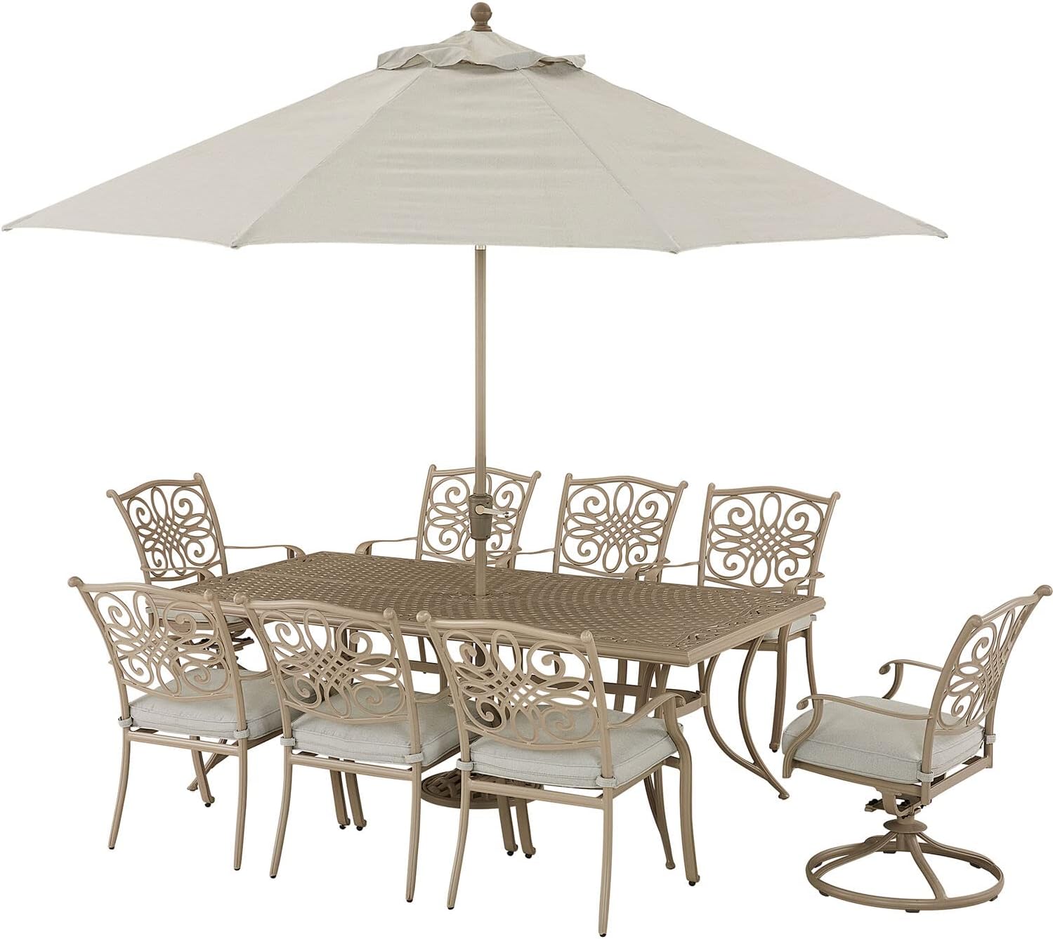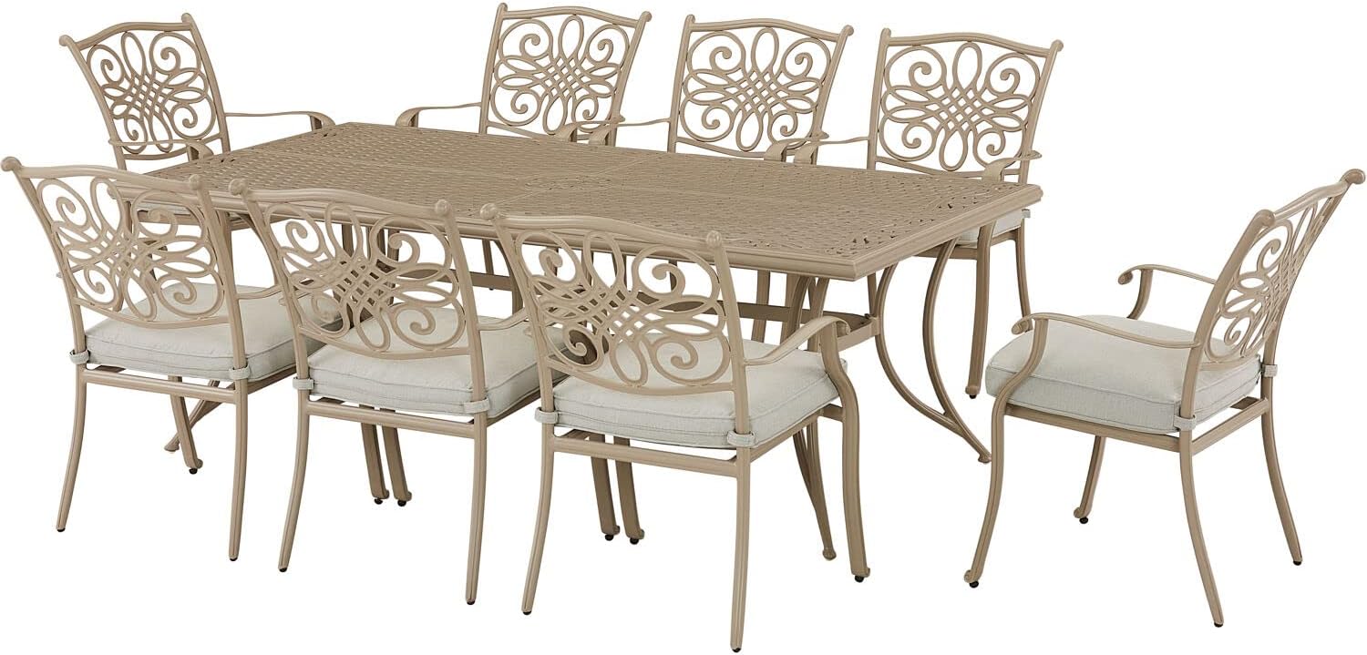 | Item Type Name | Hanover Traditions 9-Piece Patio Dining Set with 60" Square Cast-Top Dining Table and 8 Chairs with Tan Cushions, Modern All Weather Outdoor Dining Set with Rust-Resistant Aluminum Frames for Backyard |