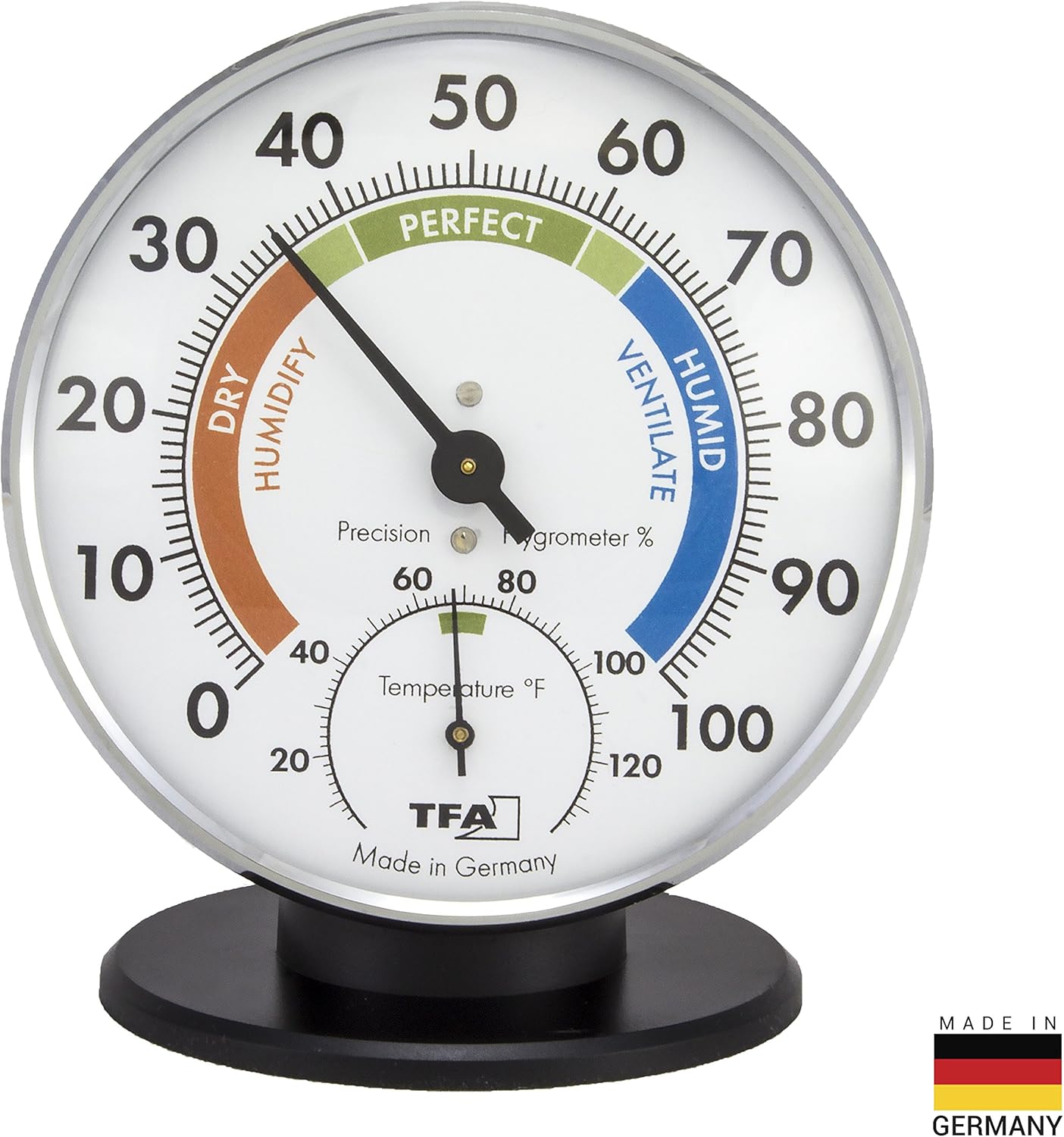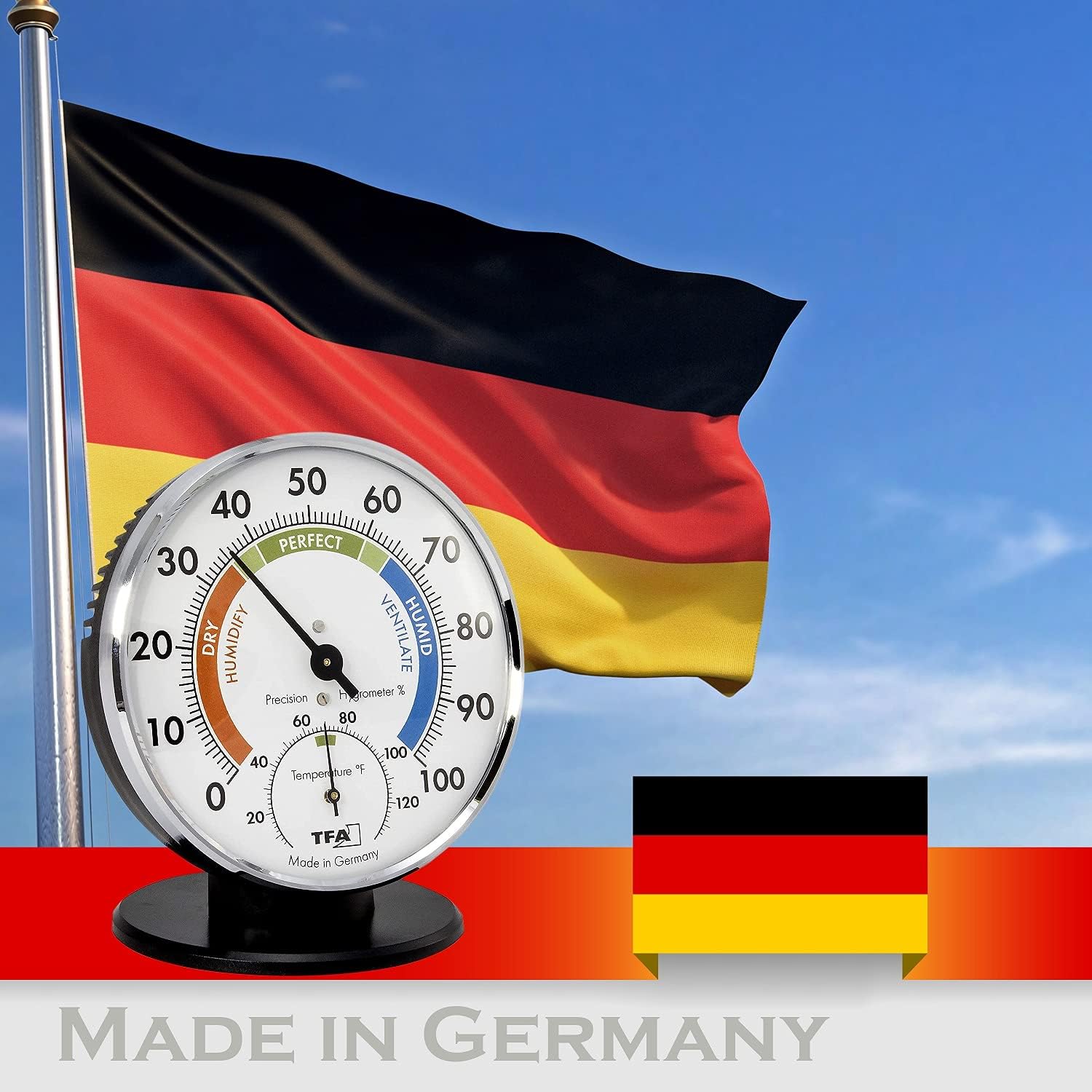 Monitor the climate in any room with the color coded comfort zones on this precision thermometer-hygrometer. Styled in chrome-brass ring and wall mounting or optional table stand.
