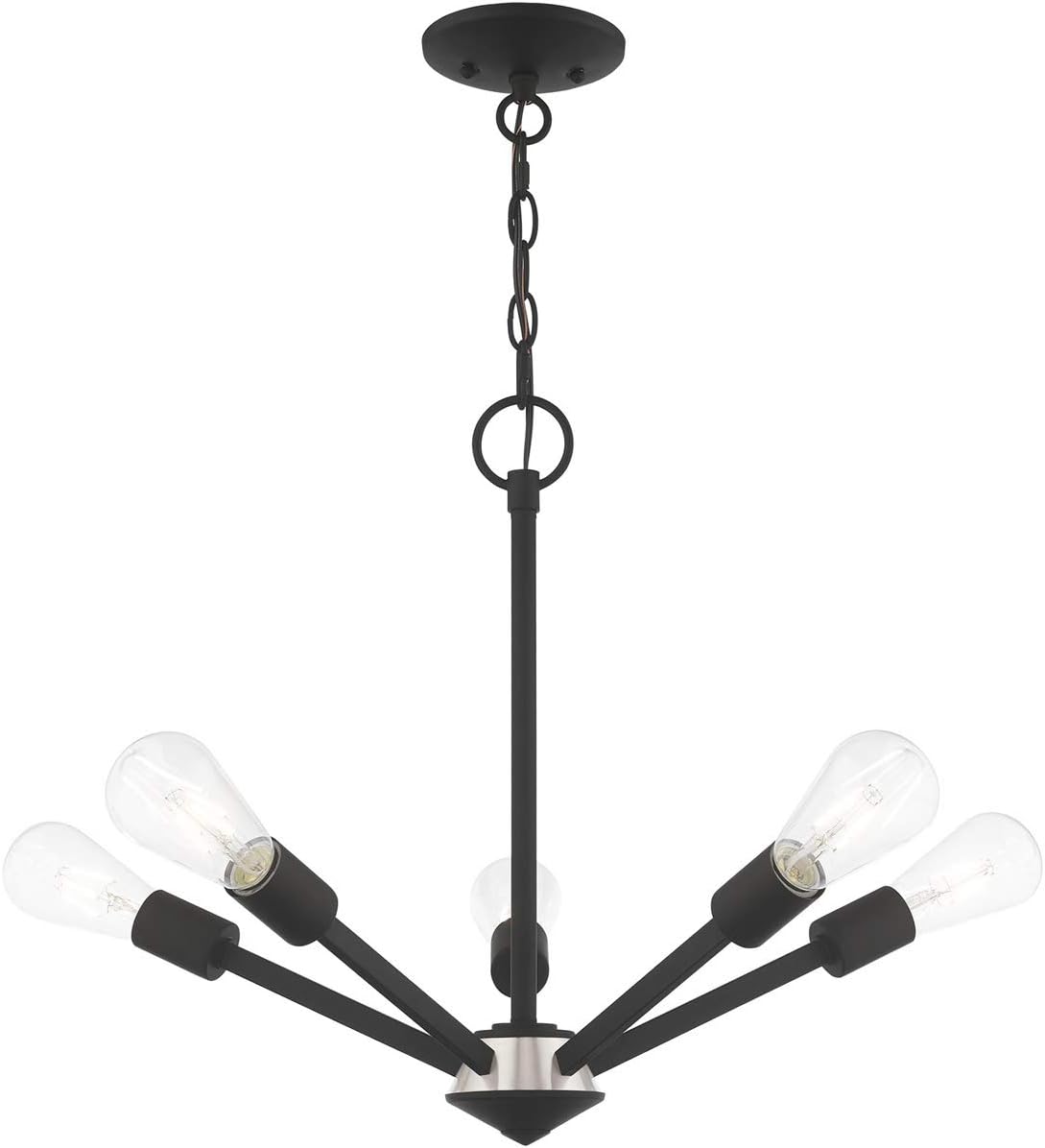 Exposed bulb sockets are fixed over black with brushed nickel accent to create an eclectic look perfect for mid century modern or transitional spaces wanting an industrial touch.