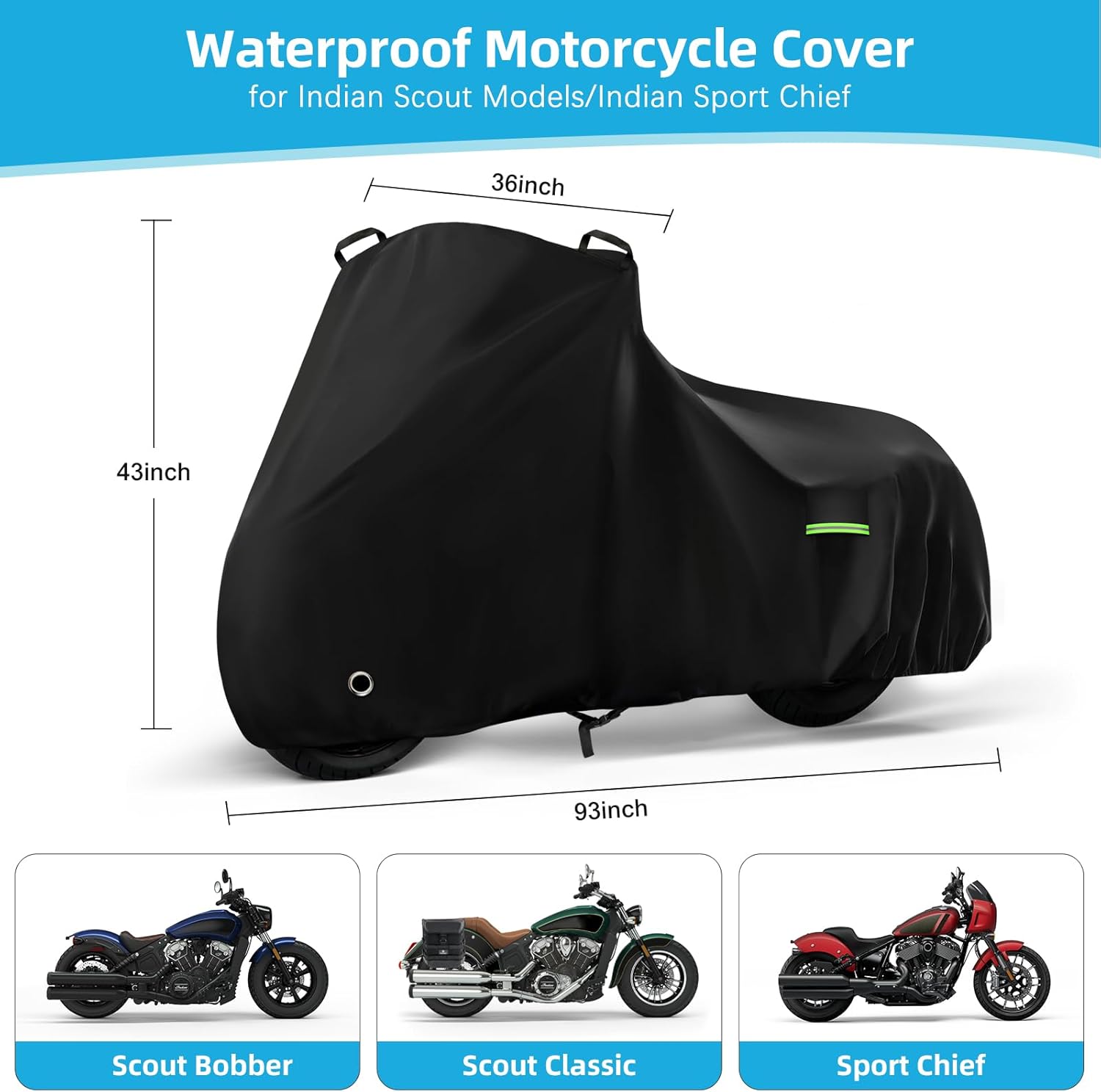 • 【Compatible with】Our waterproof motorcycle cover fits perfectly for Indian Scout/Scout Sixty Bobber/Scout Sixty Classic/Scout Sport Sixty Bobber/101 Scout/Scout Bobber/Scout Classic/Sport Scout/Super Scout/Sport Chief/Sport Chief RT. Dimensions: 93"L x 36"W x 43"H. In order to provide you with a satisfactory shopping experience, please measure the size of your motorcycle before purchasing! Make sure the motorcycle body is dry and clean before installing the cover. Enjoy a wonderful motorcycle touring trip with our excellent scout motorcycle cover!
