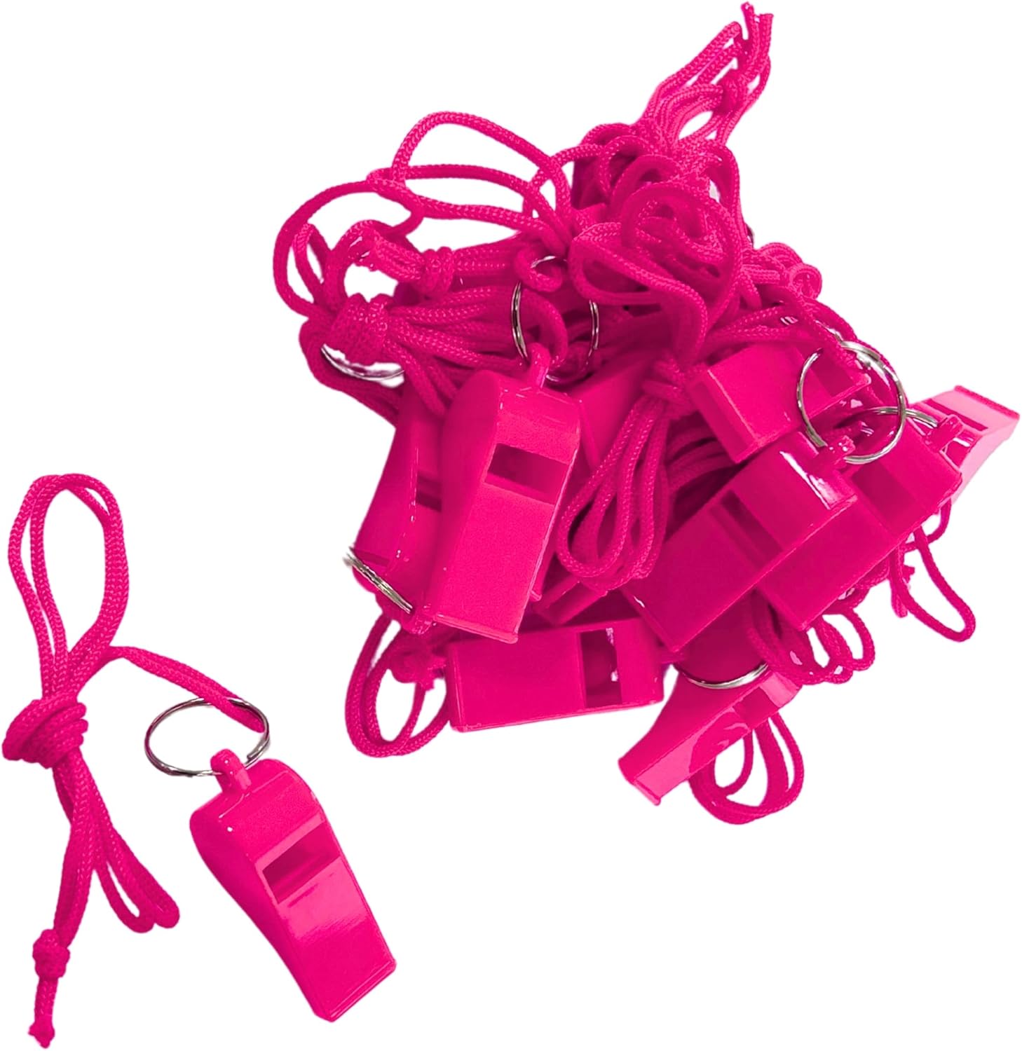 Pack of 50 Pink Plastic Whistles with Lanyard Neck Cord. This pack includes 50 durable plastic whistles, each with an attached lanyard for convenient hands-free use. Ideal for sports coaches, referees, teachers, party games, training sessions, emergencies, or crowd control. Lightweight and weather-resistant, these whistles produce a loud, clear sound and are perfect for group activities or team use. Colours available: Blue, Green, Light Blue, Pink, Purple, Red, Yellow.