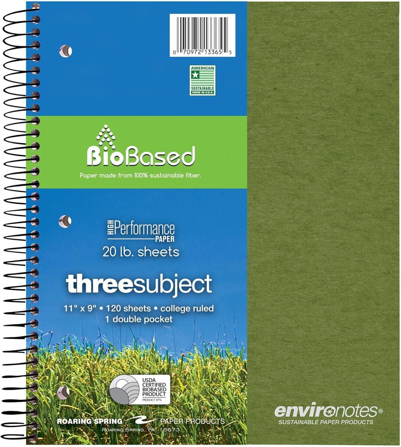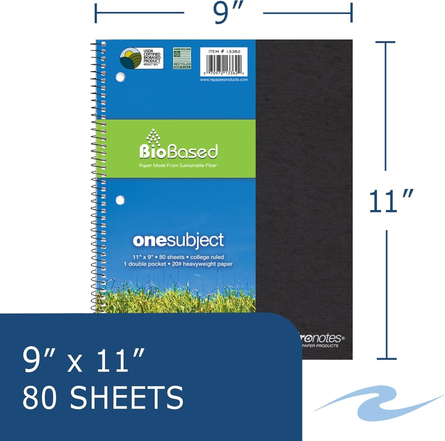 One subject "Environotes" wirebound notebook. Smooth, white, 20# writing paper is college ruled with a red margin line. Sheets are micro-perforated for easy and clean tear-out to 11" x 8.5". Paper is produced from 30% sugarcane post-agricultural fiber and 70% post-consumer content. Paper is High-Perfomance 20# allowing writing on both sides. Covers are produced from high-recycled content 25 point Reprise board, and are packed in assorted colors. The back cover is a heavy-duty 50 pt grey chipboard. A double storage pocket is located under the front cover. Wire ends are coil-locked for snag-proof performance. Each book is 11" x 9" and contains 80 sheets of writing paper. 24 units per case. Sold by the Case