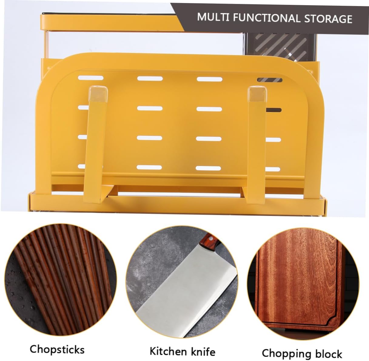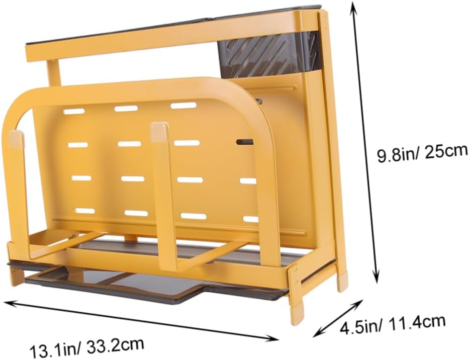 Package List 1 x Storage Rack Characteristics -Size: About 33.2x25x11.4cm/ 13.07x9.84x4.48 inch Holder. - Color: Yellow. - Material: Iron. - Elegant and space saving design, the holder rack is easy to clean and maintain Cutting Board Rack. - Multiple slot design offers a place for your and cutting board to stay firmly and sturdy enough and won't tip over Cutlery Holder Organizer. - With anti-slip design, and cutting board won't fall off Rack. - Suitable for kitchen, restaurant, hotel and all kinds of party Cutting Board Storage Shelf. - Made of material for lasting use.Goods InformationHolder The item is iron cutting board holder, which is for putting cutting board, and chopsticks.Cutting Board Storage is suitable for kitchen, restaurant, hotel and all kinds of party.Cutlery Holder Organizer With elegant and space saving design for modern kitchens, the holder rack is easy to clean and maintain